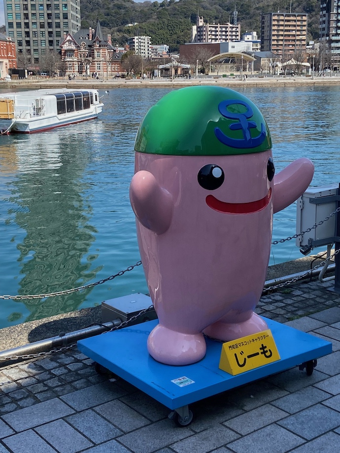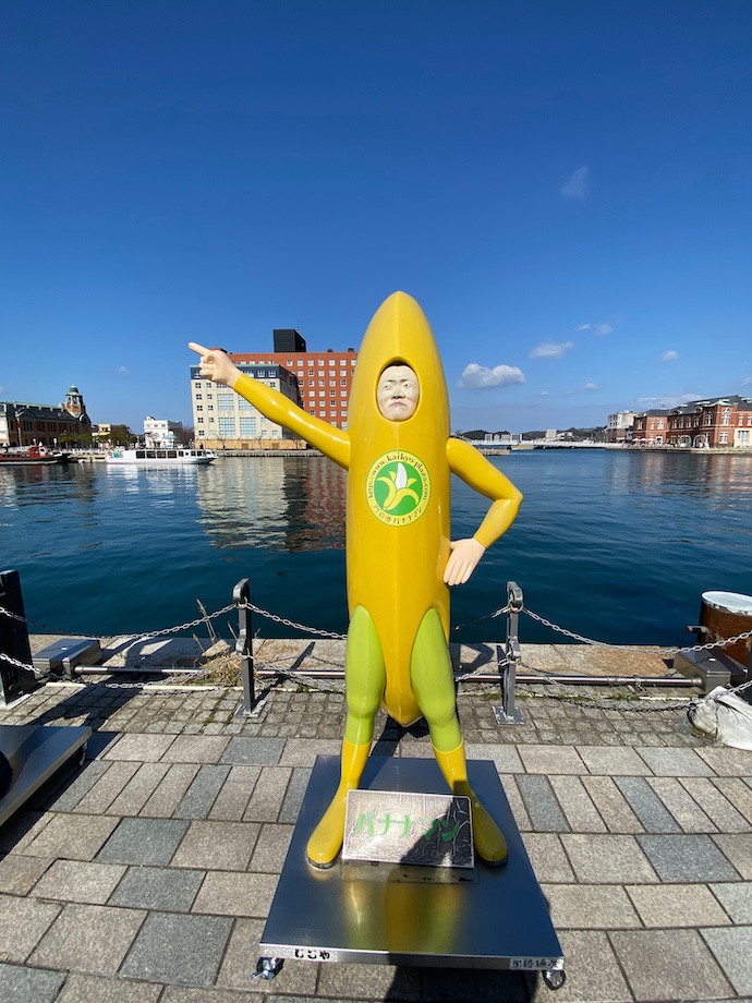 そして、レトロな感覚のバナナマンからちょっと離れたところに、現代風ゆるキャラの丸々した一体がいた。マスコットキャラであることはわかるのだが、緑の頭は一体何を意味しているのか、形状の説明も欲しいところだ。だいたいゆるキャラは設定上、人ではない妖精みたいなことが多いので、これは港のどこかにいる何かが実体化したものだと思うが。