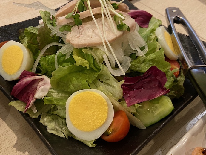 さて、最初に頼んだのはラーメンサラダた。北海道ではもはや居酒屋の絶対定番と言って良いが、いまだにラーメンサラダと野菜たっぷり冷やし中華の違いがわからない。この皿ではラーメンの麺が野菜の下に完全に隠れているというステルスバージョンだった。見た目では野菜サラダというのは、盛り付けとしてどうだろう?