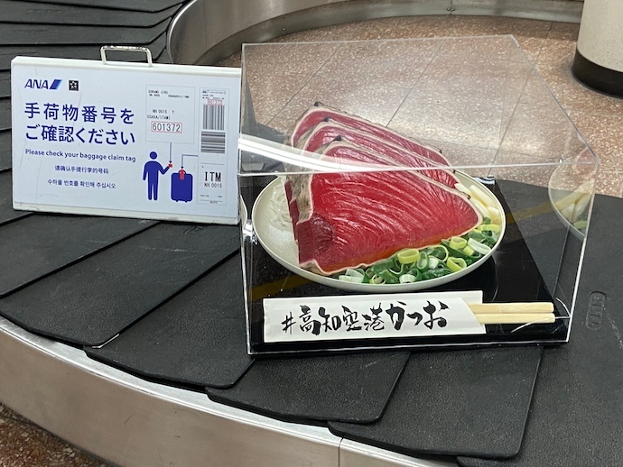 その店がある漁師町の有志がクラウドファンディングでカツオ叩き巨大サンプルを作り、手荷物を引き取るターンテーブルに乗せて、カツオの本場高知をアピールすると言い始めた。それは面白いなあと思っていたら、ついに実現していた。
