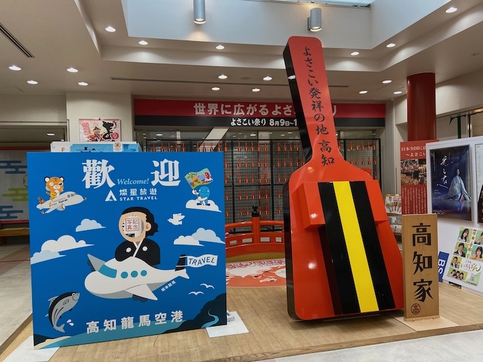 そのお祭りの主役ともいうべき鳴子(巨大バージョン)も飾ってあった。その横には空飛ぶリョーマらしき人物のパネルがある。よくみると、なんだか不思議な漢字が書いてあるので、どうもインバウンド対応らしい。ついに高知よさこいがグローバルになる日が来たかと思うと感慨深いが、それでもリアルに見に行く気にはならないのが…………