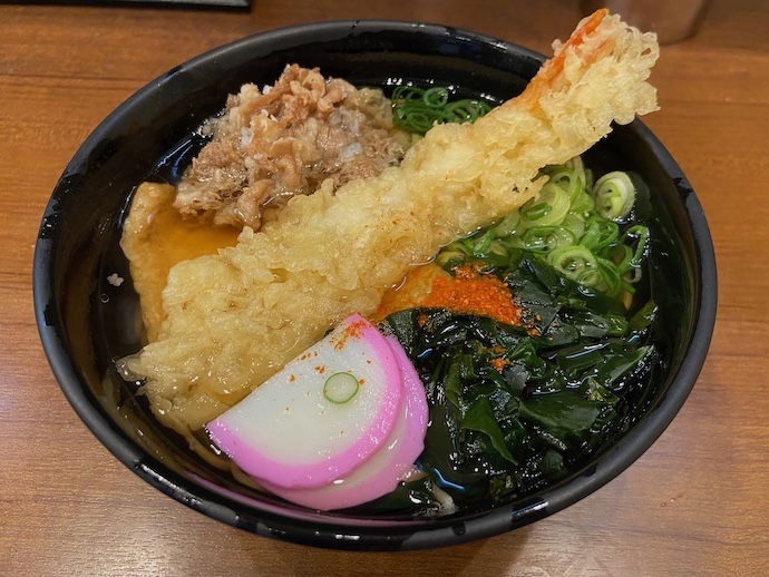 ということで、岡山駅ではちょっと奮発して営業応援してしまった。トッピング全部乗せを頼んだのだが、なんと料金はかけそばの2倍近い。が、これも一期一会だ。おそらく二度とこの店でそばを食べることはあるまい、と大盤振る舞いしてしまった。