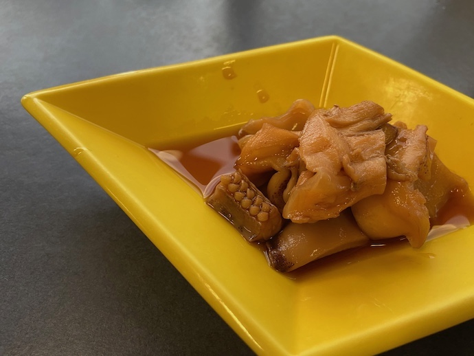 追加の料理でイカの煮物を注文してみた。どうやらおでん出汁で煮込んだ気配がある。これも醤油で真っ黒になる程に煮込んだ関東風煮物を見慣れている目からすると、やたら新鮮に感じる。イカでも上品なルックスになるのだなあ。
