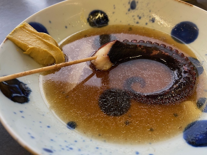 最初に頼んだタコだが、これだけはおでん鍋の中で仕上がっているものではないようで、注文後の調理になるらしい。串に刺さったタコの足は柔らかく、これまた上品な仕上がりだった。しかし、このサイズの足ということは随分と小ぶりなタコなのだな。