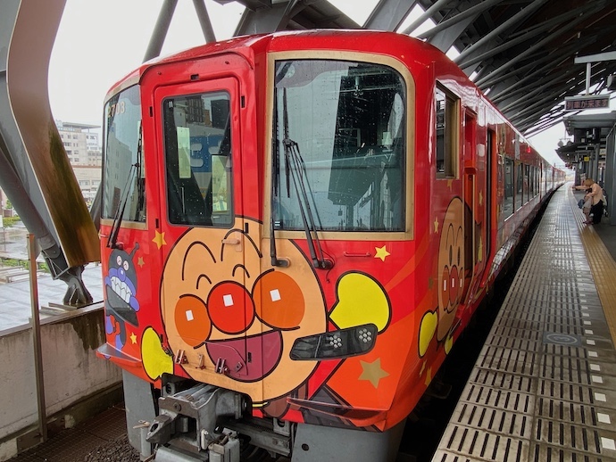 高知と岡山を結ぶ路線には「アン◯ンマン」のキャラ電車が走る。それも定時運行される特急だ。いつも高知駅ホームで西行きの特急待ちをする間、この赤い電車が止まっている。お江戸の私鉄でたまに走るコラボ系ラッピング電車とは異なり、こちらはいつでも走っている大定番の人気者だ。