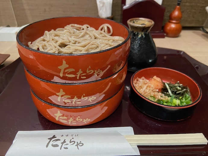 3段に重ねられた蕎麦に、薬味を少しずつ入れてい食べる。一段食べたあと、残った蕎麦つゆと薬味を二段目に注ぎ、足りなければつゆを足す。これを三段目にも繰り返す。出雲そばの食べ方だそうだ。そばは腰がありつるっと喉を通っていく。うまいなあ。