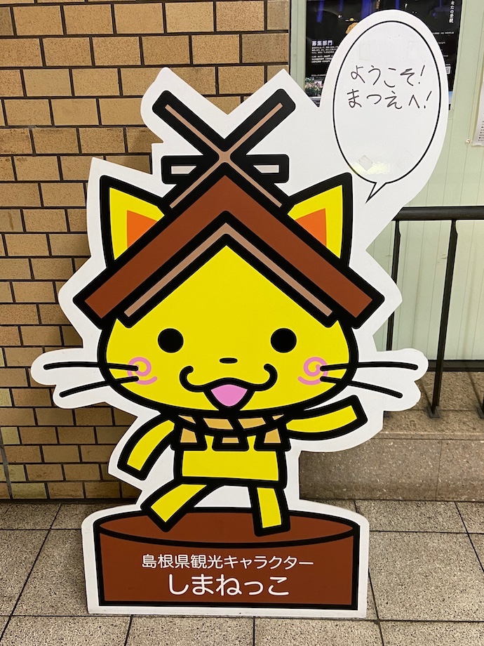 松江駅で出雲大社風アレンジの猫に出迎えられる。このご当地キャラも業界内では相当有名になっているとは思うのだが、最近のアニメキャラ風イケメン、美少女なキャラが新興勢力として全国各地で増殖中だから、そろそろリニューアルか二代目が出現しそうだなと感じる。