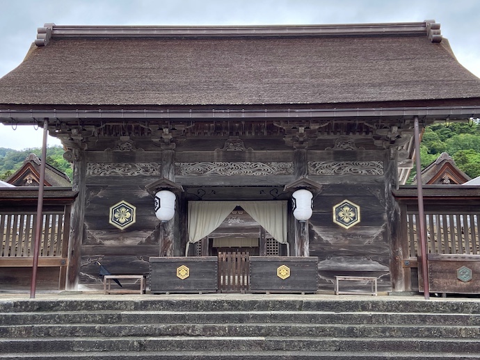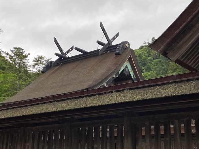 本殿は直接見ることはできないが、本殿を囲む塀越しに屋根を見ることはできる。この屋根部分が10階建てビルの最上階くらいにあると思えば、かつての大社本殿のイメージに近いようだ。いやいや、初めてお参りに来た昔の人はさぞびっくりしただろうなあ