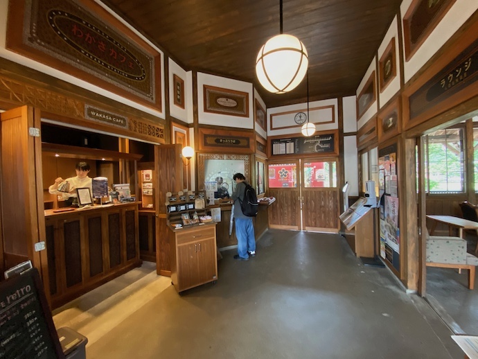駅舎の中、切符販売窓口の横はおしゃれなカフェになっていた。駅舎の中に入れたてコーヒーの香りがしている。写真右側は待合室だが、これもゆったりとくつろげる空間だった。鳥取から若狭鉄道を使い終点まで乗り鉄旅をして、駅でコーヒーを楽しみ、また帰りは始発列車に乗り込み車窓を楽しむ。実に良いぞ。鉄道は移動のためだけに使うのではなく、乗る楽しみのために使う。そんな時代になったのだなと改めて思った。