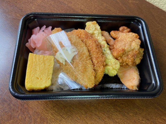 中身が見えない分は包装紙で説明をすることにして、おかずを変えても容器は一種類を使い回すと効率が良い。白身魚のフライをチキン南蛮に変えるようなバリエーション変化だ。と言うような思惑があれこれ見て取れる。コロナの時期に生まれた、本日の日替わり弁当でこの手法が使われ始めたようだ。その実物を実食してみた。