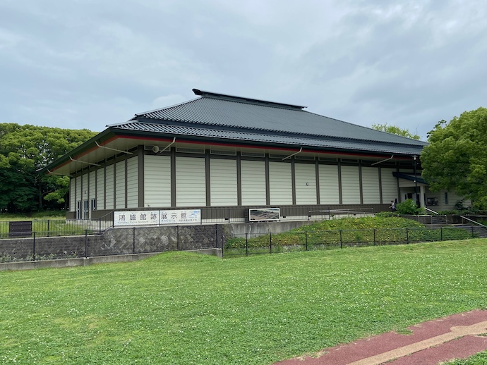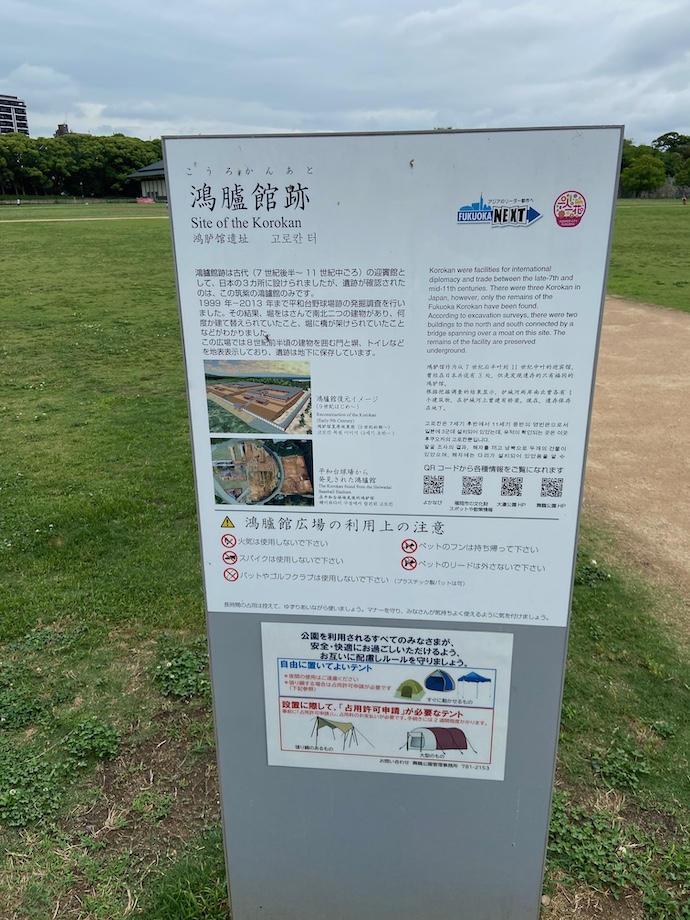 この建物の中に、古代の遺跡が残っている。目の前に広がる元野球場、芝生の広場とは奇妙な対比だが、それが歴史のある場所ということなのだ。もう少し九州の歴史をお勉強した方が良さそうな気がする。