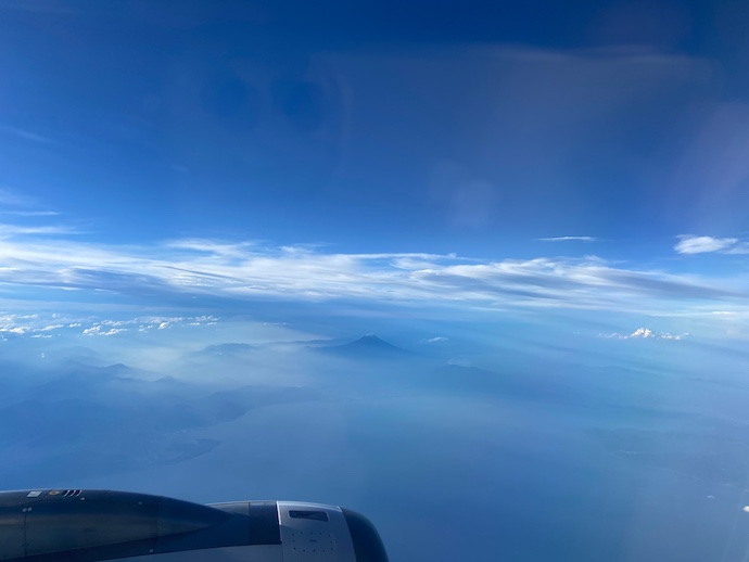 愛知県から静岡県上空に移ったと思った頃からどうも進路が怪しくなってきた。神奈川県三浦半島を越えて羽田空港に向かうと思い込んでいたら、どうもだいぶ南方に変針するらしい。そろそろ富士山が見えるはずと思っていたら、いきなり雲が広がり始めていた。写真中央部にうっすらと見える小さい出っ張りが、どうやら富士山らしい。