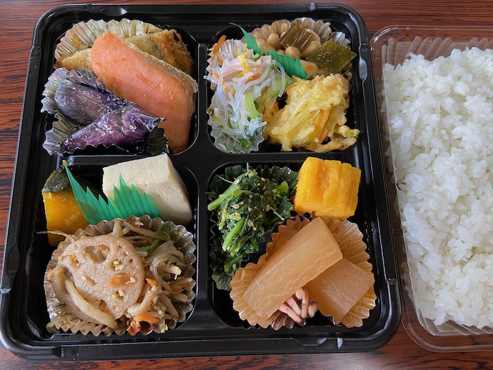 高知県の旅で気がついたことをあれこれ書き連ねてみると、一題目はお弁当の話だ。高知県西部にある四万十町で、弁当・惣菜の店を地元のお母さんたちが運営しているらしい。そこの日替わり弁当というか日替わり惣菜セットがこれだ。一箱ごとに中身はバラバラだとのこと。十種類くらいのおかず・お惣菜が詰め合わされている。これが400円なのだ。
