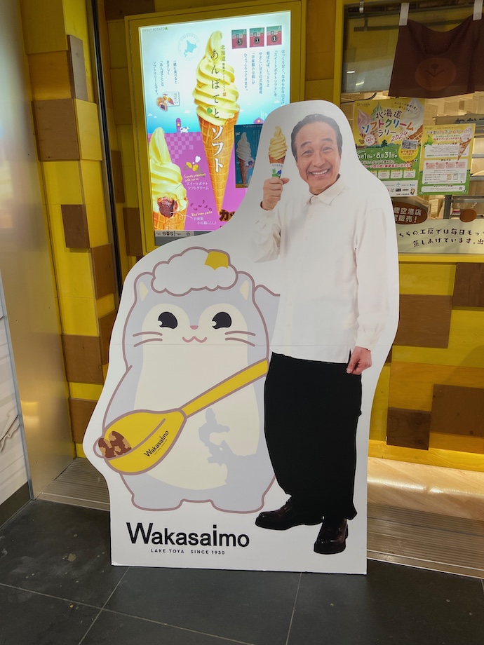 そして、こちらはかの有名な俳優さん(イメージキャラクターらしい)とのツーショットだが、確か人間の方が先行したブランドキャラ・モデルだったはずだ。人間モデルの高齢化対策に、2代目キャラとして「ゆるキャラ」が作られたのだろうか。確かにゆるキャラは歳を取らないしなあ。ただ、経年劣化するのは人もキャラも同じなのだけれど。(調べてみたらこのかた北海道三笠市出身のようだがわかさいもとのかんけいはなんだろう。社長の同級生とか?)