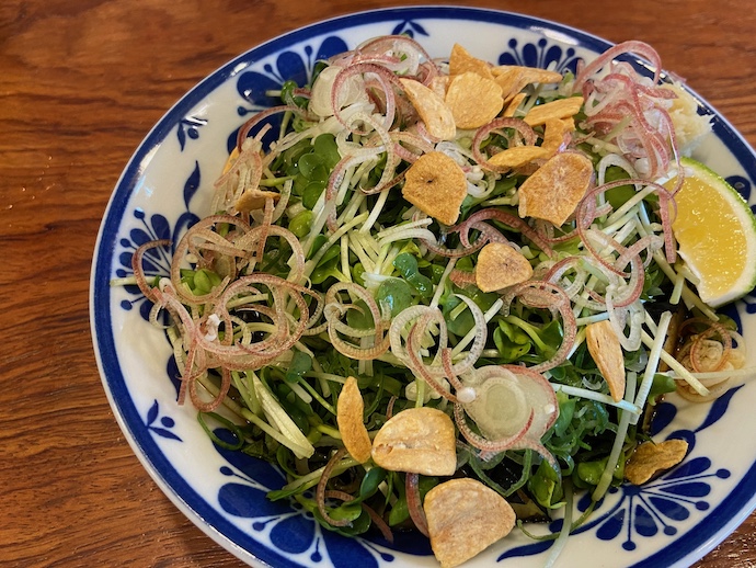 ナスのたたきも色々と流派があるようだが、この店は軽く油通しした茄子に夏野菜をたっぷりとのせている。ニンニク・チップをアクセントにして「たたきのタレ」、要はポン酢しょうゆに似たもので食べる。爽やかサラサラ系の一品だ。これも最近まで知らなかった、高知の家庭料理として定番らしい。この野菜の下にある茄子が、炙った鰹に変われば鰹のタタキになる。