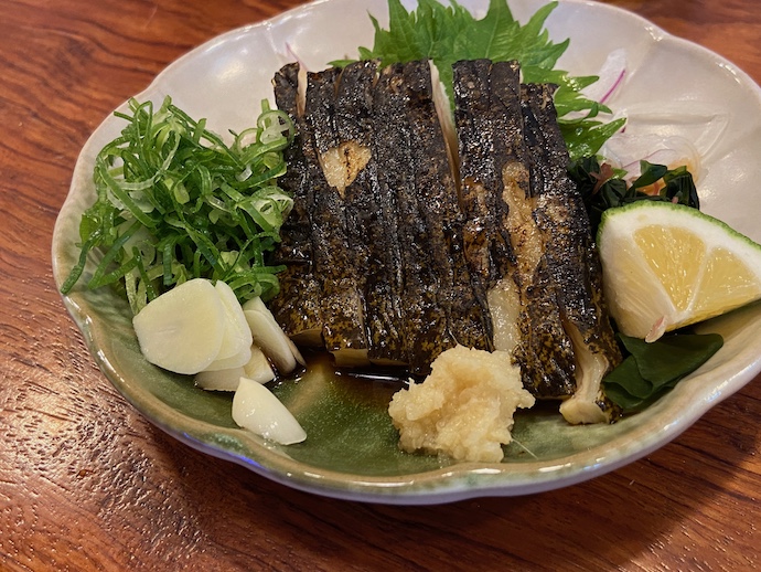 そして締めにはナスのたたき。「たたき」尽くしの夜になった。高知県でいう「たたき」は物理的にヒットする叩きではなく、焼いて表面を焦がす料理のことだと思われる。