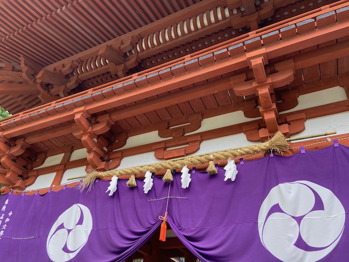 拝殿にかかる紫の幕は、なんと寺院からの寄進だった。なんとも言い難い。神と仏の助け合いなのだが、これを明治政府は嫌っていたのか。なんとも了見が狭いことだ。