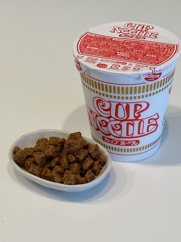 通常のカップヌードルに入っている謎肉は4ー5個だったと思うが、10倍くらい入れてみようと考えた。個数を数えたわけではないが、ざっくりと10倍くらいの目分量を袋から取り出した。