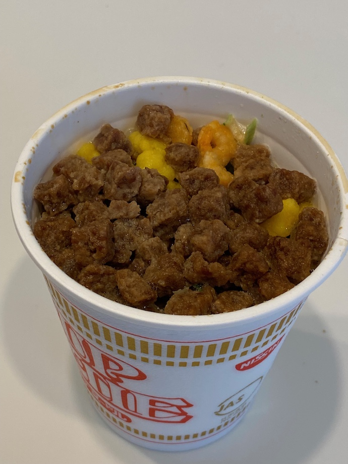 謎肉大盛りの実食をするべくカップヌードルを買ってきた。これは、カップヌードル以外で試しては行けないと思う。他メーカー品はもちろんアウトだが、シーフードヌードルとか味噌味とか、ともかく味変したものはいけない。(個人的見解です)