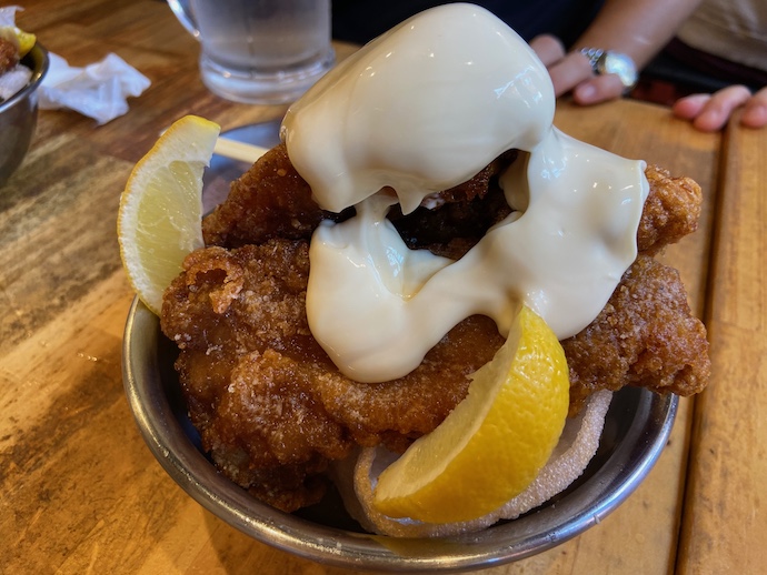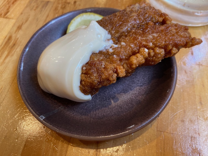 何よりすごいのが、唐揚げにかかっているマヨネーズの量だ。唐揚げは骨なし肉でおそらく150gくらいだろうか。それにマヨネーズは50gくらいかかっている。カロリー計算をしたら気が遠くなりそうな「お通し」だった。