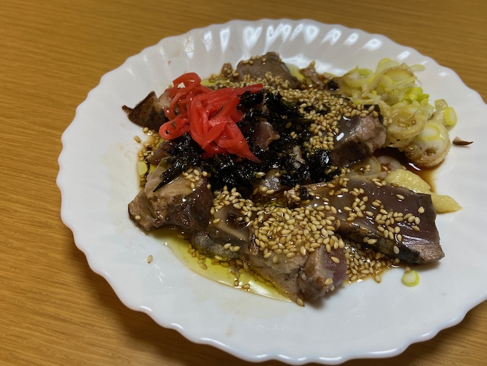 カツオ自体にはごま油と醤油で甘辛い味付けができている。そこに青ネギを散らすと色気が良いのだけれどあいにく自宅には青ネギの在庫がなかった。ゴマのプチプチ感とカツオのまったりとした柔らかさがよく合いますねえ。酒の肴としては一級品。