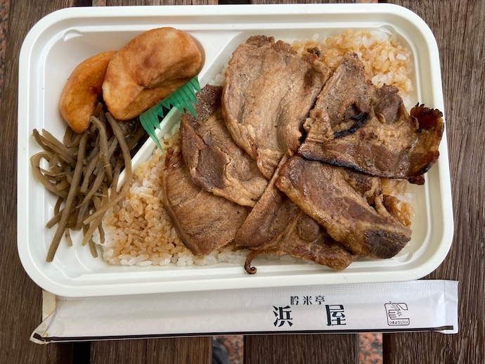 話が横にそれ過ぎたので弁当の話に戻すと、これは焼肉弁当の変形だろう。白飯の上に敷き詰められた豚焼肉をワシワシと食べる、米主力の弁当だ。実際に食べてみると、米の量が本当に多い。良くも悪くも牛丼的な、おかずになる肉がちょっと足りないよと言いたくなる弁当だ。ただし、腹ペコの時に一気喰いするにはちょうど良い。函館ハセストのやきとり弁当と良い勝負だ。添え物的についているフライドポテトがちょっとおかしげだが。これもご愛嬌か。
