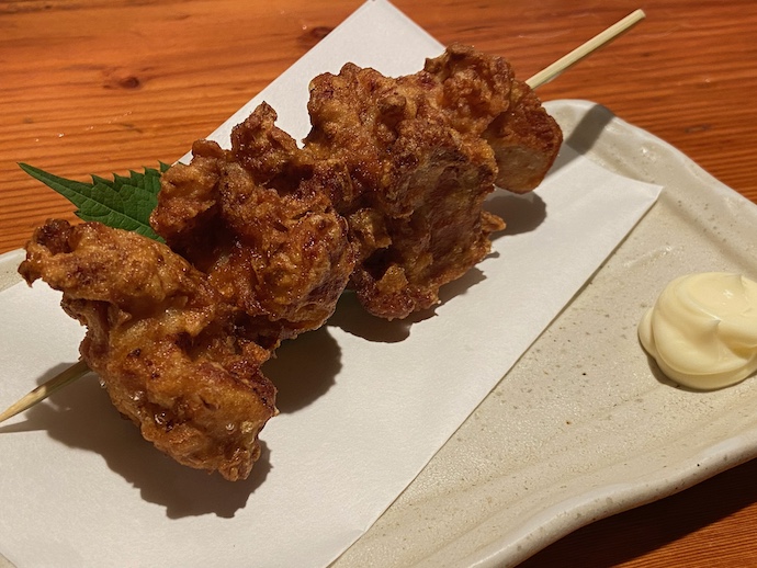 もう一つ気になっていたのが「岩下の○生姜」を使った鳥唐揚げだった。生姜を使った食べ物は気にいっているので、これも勇んで頼んだのだが大正解だった。ただし、出てきた時はルックスにびっくりした。串に刺さった唐揚げが登場して生きたからだ。失敗して黒焦げになった焼き鳥が間違って出てきたのではないかと思ってしまった。