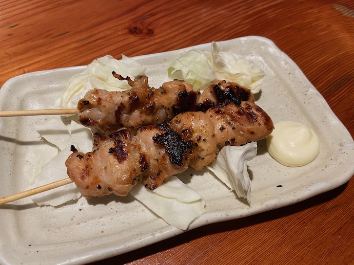 さらに載っているマヨネーズにちょっと驚いた。そういえば、焼き鳥にマヨネーズをつけて食べるのは初めてかもしれない。マヨネーズをつけてみても、普通に美味しい黒胡椒焼き鳥だった。