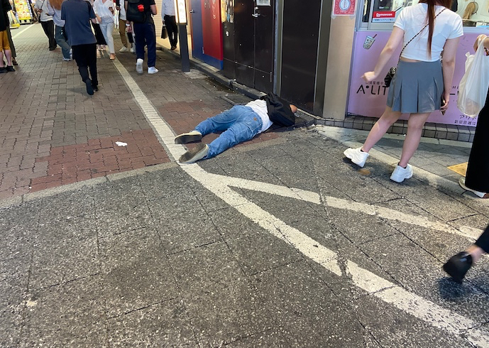 新宿歌舞伎町は、おそらく10mおきに防犯カメラが仕掛けられているので、何かあった時には画像記録が残っているはずだ。だから、こうして道で寝ている人も、それなりに安全と言えば安全なのだろう。夏の終わりとは言え気温は夜でも25度近くあるし、北海道薄野の冬のように凍死する危険もない。終電までに目が覚めればとりあえずおうちには帰れるだろう。経験的には、30分ほどすると、路上睡眠者のほとんどはいなくなっている。路面の冷たさで目が覚めて帰るのだろう。