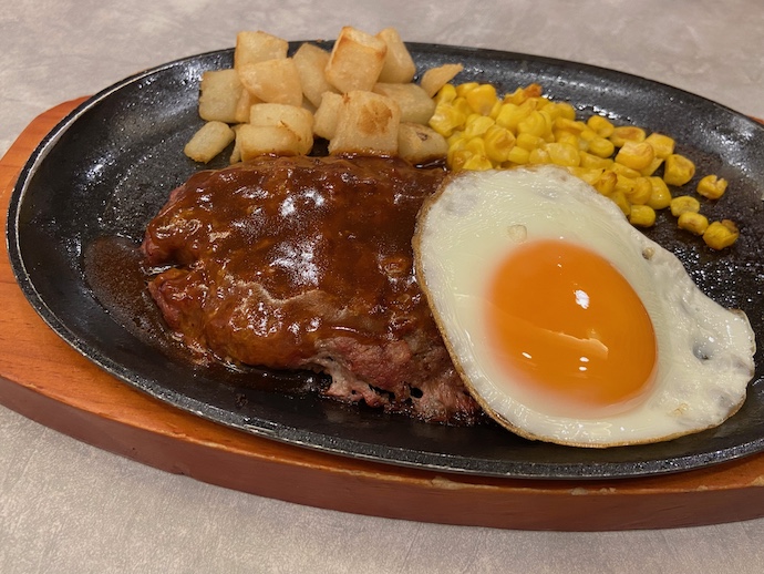 ハンバーグには目玉焼きがのっている。いかにもサービスですという感じが素敵だ。半熟の黄身を肉と合わせるとこれまた美味い。ポテトとコーンの付け合わせはハンバーグの定番みたいなものだが、この量もよく計算されていると思う。400円で与える満足感としては、日本の有数外食チェーンの中でダントツ、群を抜いたトップだ。某ハンバーガーM社も普及品ハンバーガーではこのレベルに遠く及ばない。ブランド代表商品のBigMですら、このワンプレートハンバーグには負ける。ましてやフライドチキンや牛丼では敵うはずもない。