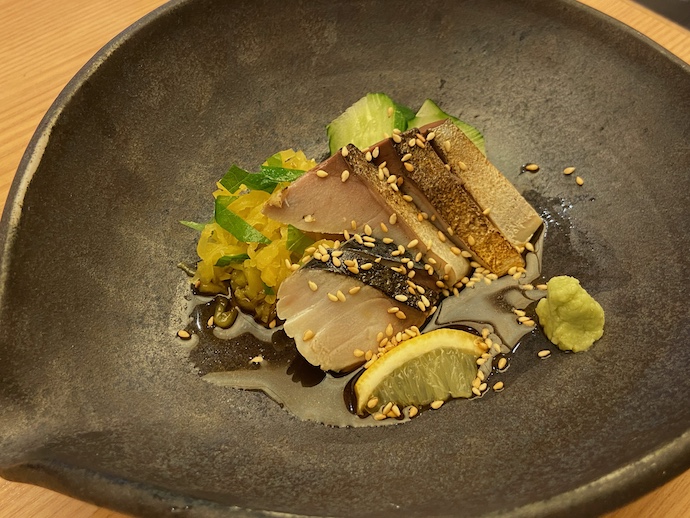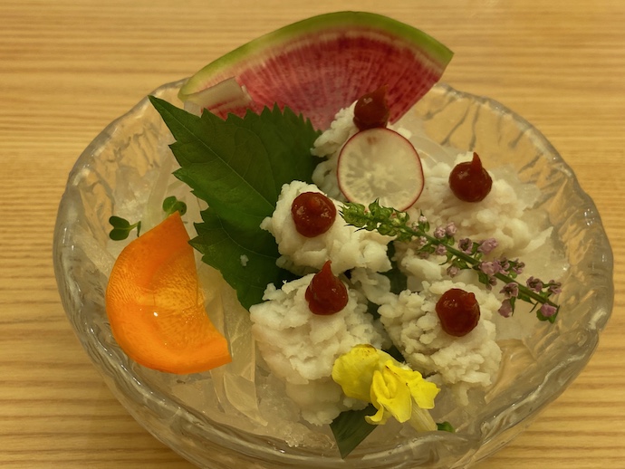 まず最初に頼んだのは、夏場の関西に来ると必ず食べたくなる「はも」だ。湯引きとか、おとしとか、色々呼び名はあるようだが、丁寧に骨ぎりをした鱧を梅肉で食べるのは、夏限定な無常の喜びだ。ここでは「はもちり」というメニューになっていて、ちょっと混乱したが、ビジュアルも含め美しい商品を堪能した。
