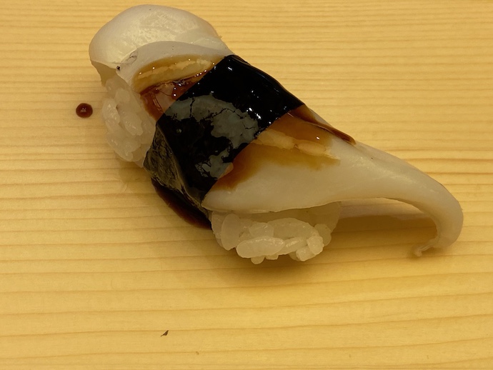 どうしても追加で食べて見たい「ゲソ」を一貫だけ注文した。タコもそうだが、ゲソにも甘だれが塗られていると旨さが10倍くらいに跳ね上がる(個人的感想です)