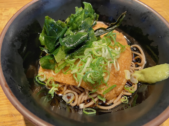 注文したのは冷やしきつねそばだった。ただ、関西アルアルのうろ覚えなのだが、キツネはうどん、タヌキは蕎麦でどちらも油揚げが乗っているものだと記憶していたが、店頭でメニューを見るとうどんも蕎麦もキツネだった。そして、タヌキがメニューに存在していない。よく見ると、メニュー写真は全てうどんだった。つまり、この店で蕎麦はサブ、うどんがメインなのだろう。