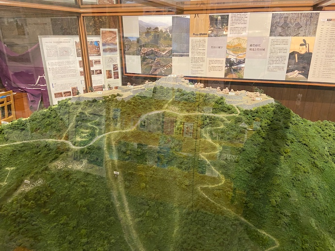 資料館に行くとジオラマがあり、これは見るだけで良い場所だなという気がしてくる。城攻めをする立場に我が身を置き換えると、実に嫌な城だ。前面は聳り立つような急斜面で、後背地はいささか斜度が緩いようだが回り込むのは、道無き道を突き進む覚悟が必要になる。とても大軍を率いて攻め寄せるルートがあるとも思えない。