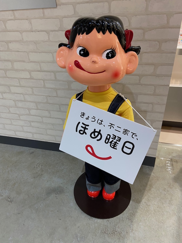 そして、あまり時間が経っていないのに、また新しい店でこの人形を発見した。西武鉄道本拠地に開いた大型商業施設の中、高級パン屋の隣に老舗洋菓子店として開店したらしい。神戸や東京のビッグネームなケーキ屋が入っていてもおかしくない好立地だった。ぺこちゃんの復活はなんとも嬉しいものだが、今の子供達やその親世代にとって、この人形はどんなイメージがあるのだろうか。