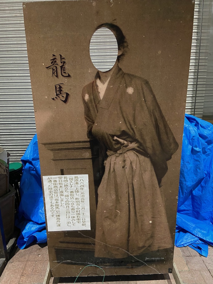 アーケードは人が歩いていないが、灯りは結構明るい。どこかにラーメン屋でも開いていないかとキョロキョロとしながらアーケードの端から端まで歩いてしまった。アーケードの終わりくらいの場所に、なぜか龍馬のスタンドがあった。なんだなんだ、島原にも熱烈龍馬ファンがいるのかと近いてみると、なんと歴史的な背景が説明されているではないか。