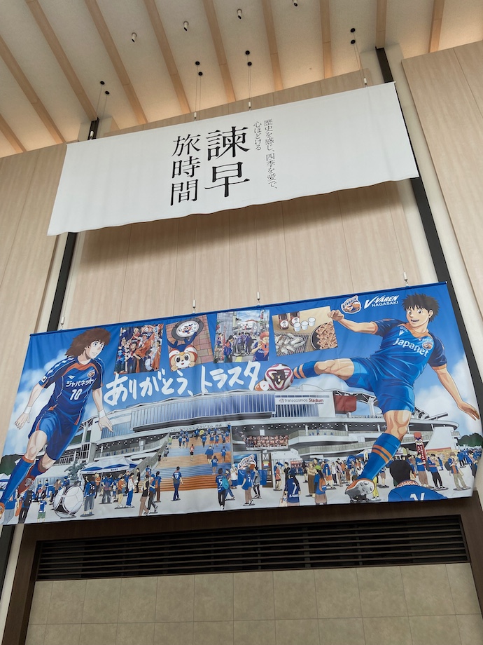 乗り継ぎのために降りたのが諫早駅だった。予想していたよりはるかに巨大な駅で驚いたが、ここは長崎新幹線の駅だった。駅構内に大きなポスターが掲げられていて、なんのことか調べてみたらJ2サッカーチームのホームグランドがここにあったのだが、それを新設された長崎スタジアムに移すとのこと。これまでお世話になりましたということらしい。