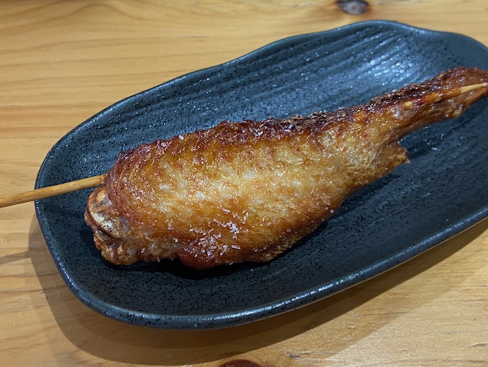 サイドアイテムで手羽先唐揚げがあった。串に刺さって一直線に伸びている。これもどこかで見たような気がするが、長崎名物なのだろうか。よくわからないまま、ラーメンを完食し手羽先をたべきった。諫早で通りすがりに入った長崎ラーメン店では、沢山の疑問点が見つかった(笑)