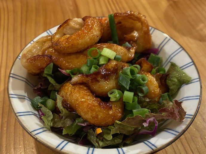 九州ではよく見かける甘酢の鶏皮を注文したら、なんとびっくりするボリュームで登場した。お江戸の居酒屋もこれを見習って欲しいものだ。お江戸スタイルを想像して注文したのだが、これだけで腹が膨れそうな勢いだった。