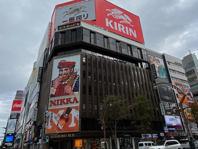 テレビでよく見る「薄野」の象徴、ニッカウイスキーの看板があるビルは、ススキの交差点の斜向かいから撮っている映像が多い。それをちょっと変化したアングルで撮ってみた。これはビルの西側から煽り気味で撮ったもの。