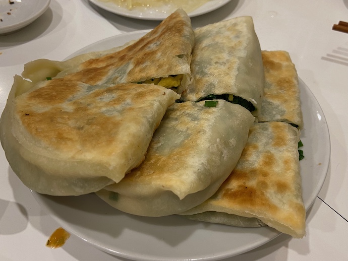 厚めの餃子の皮に、これまたたっぷりとニラを入れた餡をくるんで焼いた「餅」が出てきた。日本語でいうところの「もち」ではなく、チャイナなモチである「ピン」だろう。まさにサイドアイテムではなく、腹持ちのするメインディッシュだ。これだけを昼飯にすると、ちょっと変わったチャイニーズランチになりそうな気がする。日本的にアレンジすれば「肉まん」になるのだろうけれど。案外餃子の原型はこんな料理だったのかもしれない。