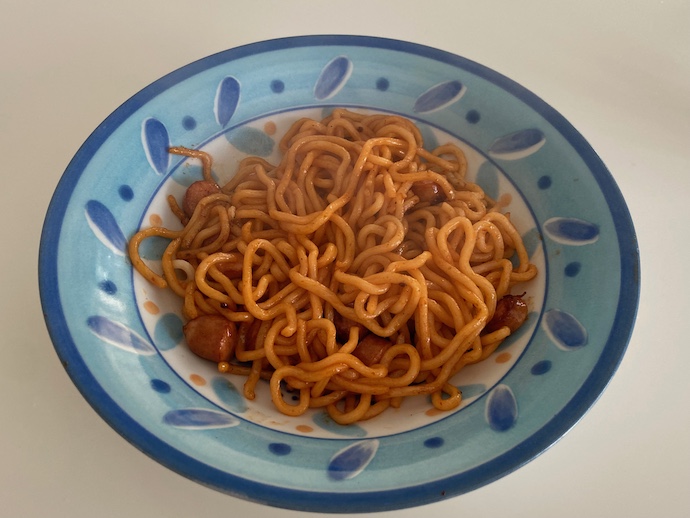 家に戻って作ってみた。焼きそばの変形と言えばいいのだろう。小学校の給食で出てきたソフト麺よりはかなり上等だ。おそらく具材のアレンジで随分とゴージャスに見せることもできそうだが、この簡易版パスタというか洋風焼きそばはシンプルな方が似合っている。