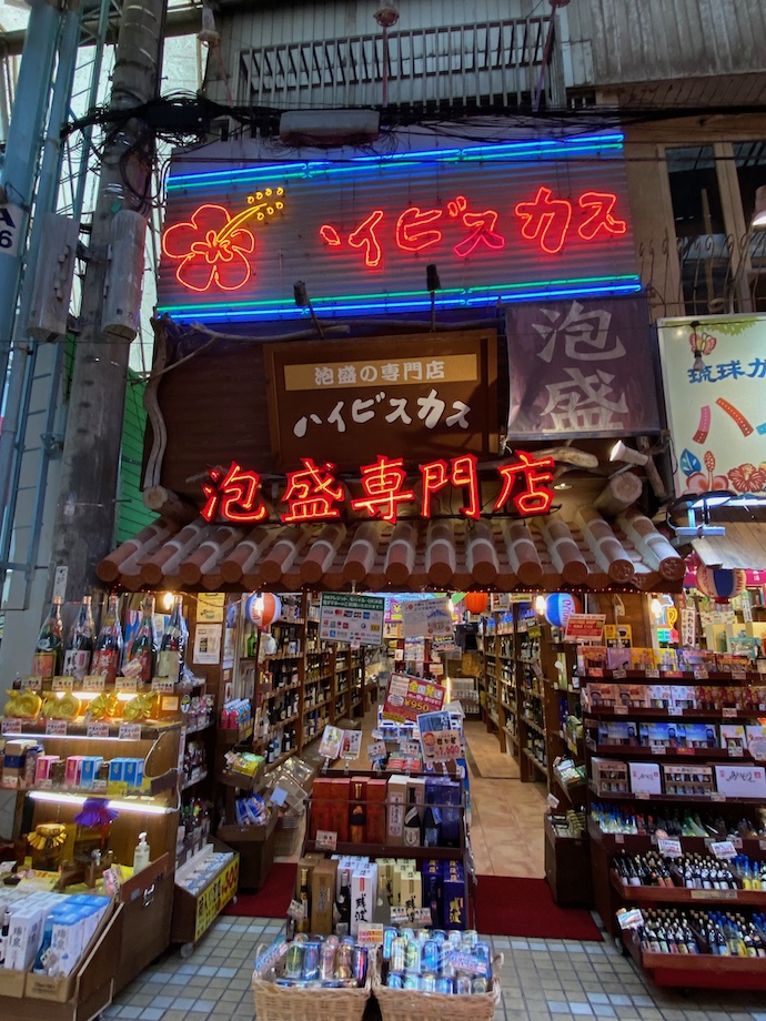 すでに日本にいることを忘れるような異国チックな店頭で、泡盛が店内中に溢れていた。一合程度の小瓶が無数に並ぶ。種類の多さが売り物だろう。ただ、午前中にここで泡盛を買う客がどれくらいいるのかなと感じる。おそらく夜になれば、酒好きの観光客が群れをなして押し寄せる?のかもしれない。