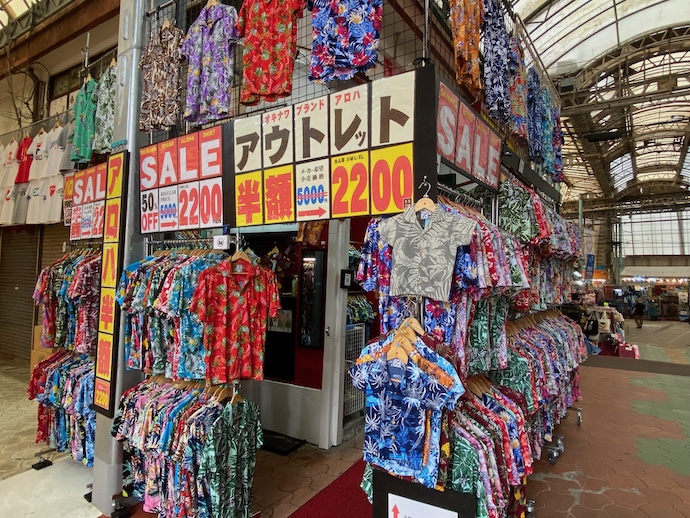 その古着屋に近くに極彩色で目がパチパチしそうな店があった。なぜ、沖縄でアロハシャツというツッコミもありつつ、これはただただすごいと思わせる。一体誰が買うのだろう。合成繊維のペラペラ感が実にトロピカルな感じを醸し出してはいるが。ちょっと沖縄文化を下調べすると、かりゆしウェアに気がつくと思うが。ただ、かりゆしはそれなりのお値段がするからなあ。