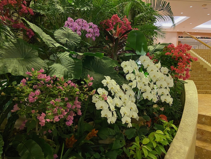 ロビーにはたくさんの花が設られていた。この時期の花といえばシクラメンくらいしか思い出せないが、この量感には圧倒される。やはりトロピカルなのだなあ。