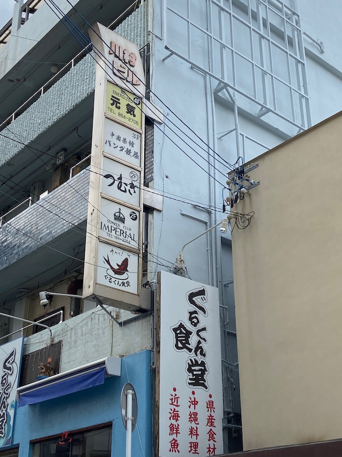 どう見てもマンションのようなビルにのき看板がずらりと並んでいる。どれも飲食店のようだからマンションではなく個室営業みたいなものなのだろうか。見れば未rふほど気になる。何よりも気になるのが「ぐるくん」食堂で、これはビルの一階にあるらしい。しかし、ぐるくんとは魚の名前のはずで、他の地方で例えてみれば「あきあじ」食堂とか「ビンタ」食堂みたいな感じになるのか。ちなみにあきあじは鮭の北海道方言。ビンタは高知でキハダマグロを指す。なんとも不思議な名前だ。