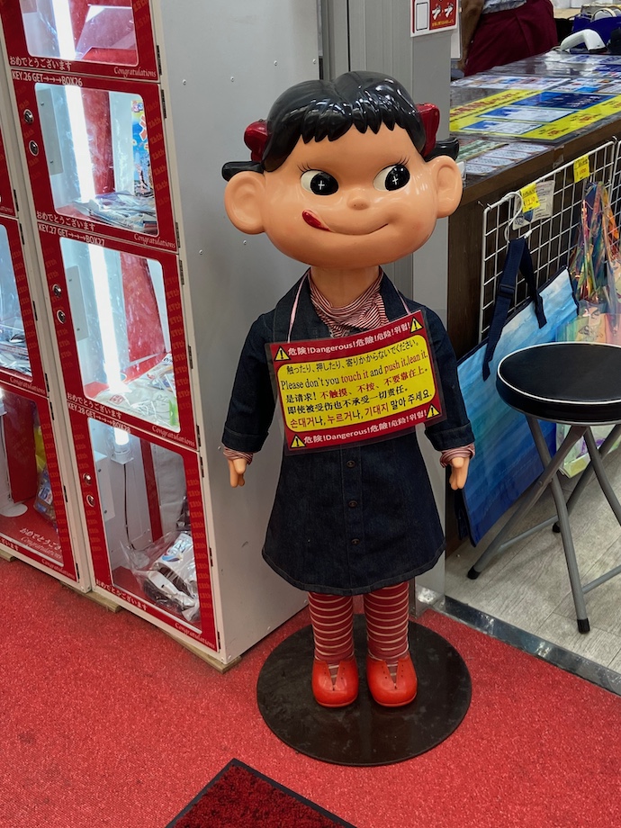 などと思っていたら、近くにはかの国宝的存在「ぺ○ちゃん」がいた。それもブラック仕様だ。この黒服姿には驚いた。いつもの赤いパンツ姿とは異なり大人びた感じもするが、喪服っぽい感じもする。やはり賑やかにピンクとか黄色とか赤の衣装がよく似合うと思う。