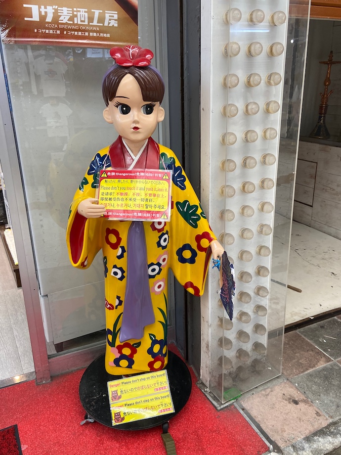 こちらは元祖国民的フィギュアのリ○ちゃん、あるいはその一族であるように思える。琉球分なコスチュームだから、ど当地フィギュア系とも言えそうだ。めんそーれと歓迎の言葉が書いてあるかと思ったら「さわるな」「のぼるな」という警告文句が各国語で書かれている。うーん、沖縄観光客はバイオレンすなやからがおおいらしい。この可憐な像を大事にしない奴は犯罪者として厳重処罰してもおかしくない。