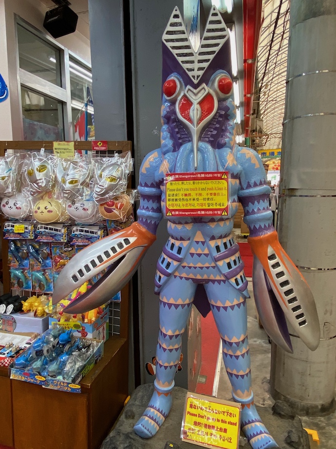 那覇国際通りから通りを抜けて入ったところに牧志公設市場がある。その公設市場へ通じる通りがなんとも観光客向けの賑やかで楽しい場所だった。以前に来た時より、ポップな感じにパワーアップしていた。その一本入った道沿いにはなんだかやたらと立体像が並んでいた。