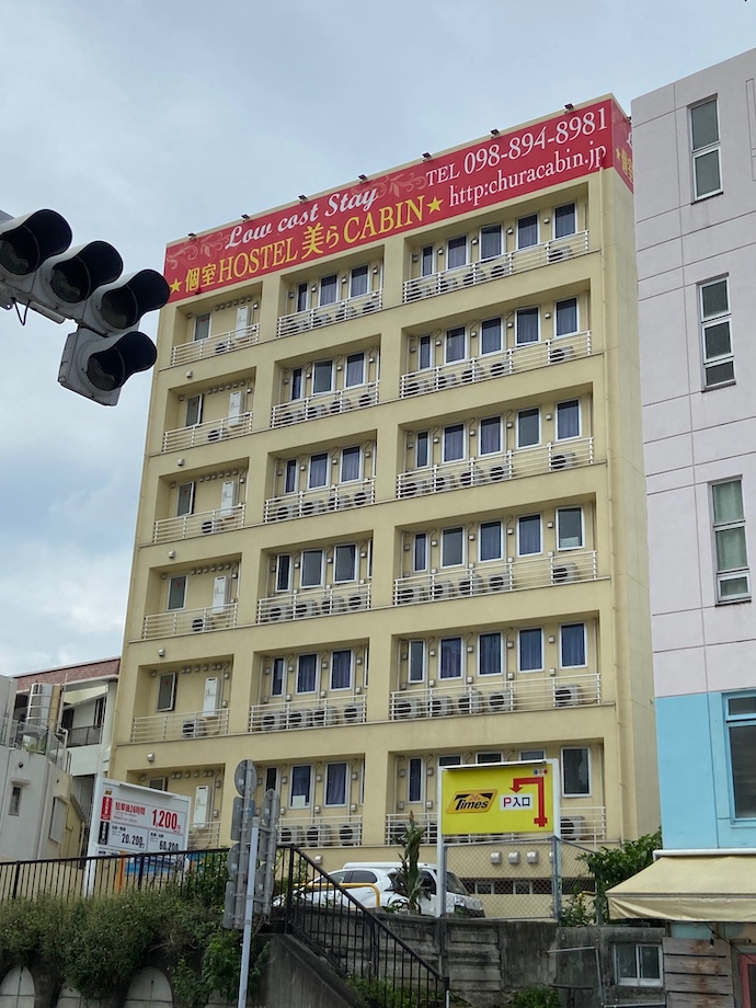 国際通り沿いに大きなビルがあった。よくよく見るとホテルではなくホステルだった。後で気になってサイトでし食べてところ、窓の幅が部屋の幅になっている個室の睡眠所みたいなものらしい。カプセルホテルの進化版のようだ。シャワーとトイレは共用だが、エアコンとテレビじゃ個室についている。格安価格だし、若い年代だけではなくソロ旅行好きのジジババでも使えそうだ。