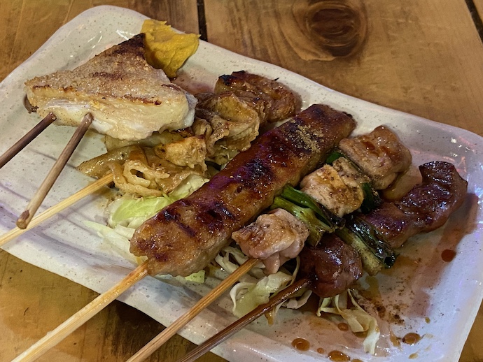 オムライスを半分ほど食べたところで、隣の客が食べている串焼き盛り合わせに目が入ってしまい誘惑に負けた。腹が大部膨らんでいるのだが、ついつい気前よく盛り合わせを頼んでしまった。